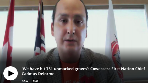 Cowessess 原住民酋长Cadmus Delorme在周四上午的网路新闻发布会上发表讲话,强调发现的不是乱葬坑,而是无标记的坟墓。