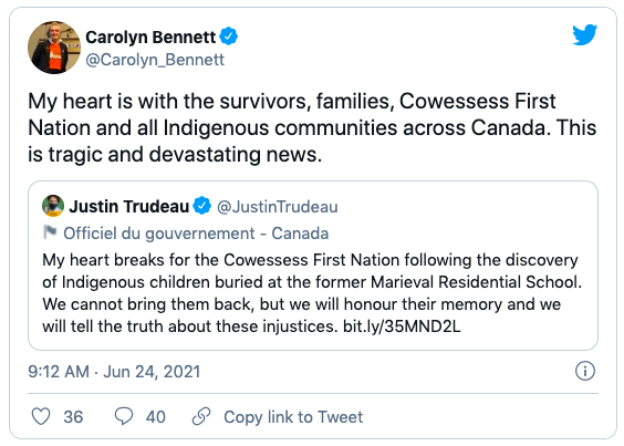 原住民事务部部长Carolyn Bennett对事件表示痛心!