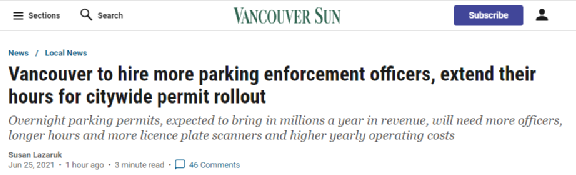 上周,温哥华市政府宣布提案,将把该市所有的车位(大约30万个)全都变成收费车位。按照相关提议,每个需要进行过夜停车的温哥华市民,都必须交45加元(访客是3加元/晚)以获取停车牌。(详情请点击[突发]以后在温哥华买新车,或要每年多交1000刀!人人还得……)