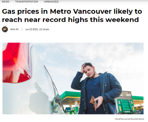“6月25日87号汽油每升价格将升至 1.699 加元,甚至可能升至 1.709 加元,”McTeague说,“也可能比2019 年出现的历史最高位还高,当时约为 1.72 加元”。他同时表示,大温地区的油价可能需要一周才能有所回落,且高油价将会是未来好几个月的新常态。。