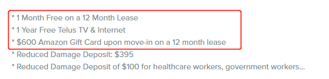 埃德蒙顿的公寓就更厉害,除了提供一年免费电视和互联网,还送价值 $600亚马逊礼品卡,前提是只要签署12个月的租约。