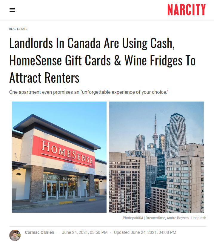 现在,有不少大城市的房东为了吸引房客使出浑身解术,用送现金、Costco,HomeSense等礼品卡,装满红酒的冰箱,甚至iPhone 12等办法来吸引租房者。