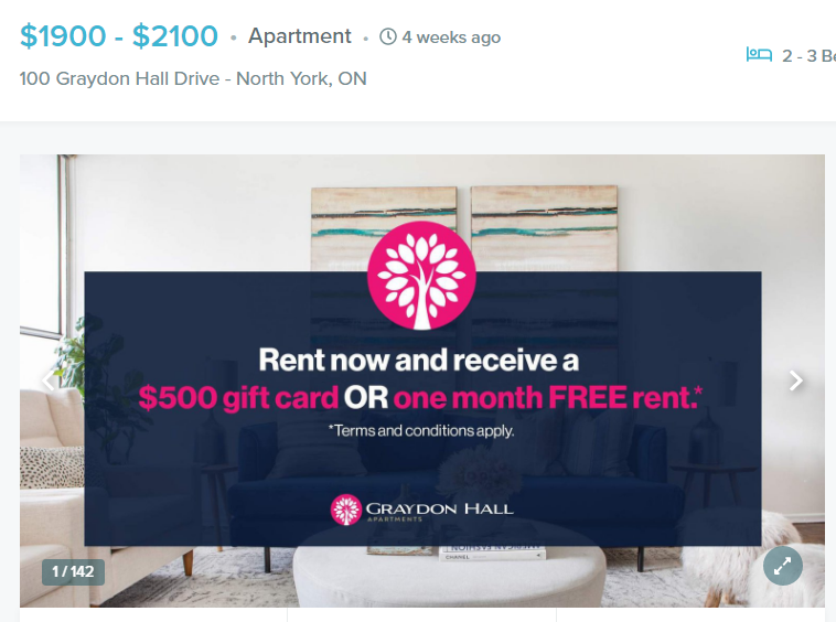 在多伦多北约克的某出租单元,只要租房,就能拿到Costco、HomeSense或 Wayfair 价值$500 的礼品卡。