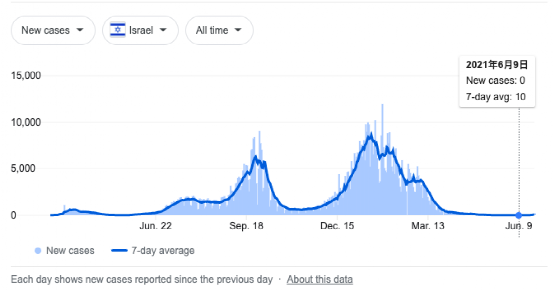 因此,在经历了2020-2021冬春季节严重的新冠大爆发后,以色列的疫情迅速得到了控制。到今年3月下旬,单日新增病例下降到1000例以下,到4月底5月初进一步降低到2位数,5月底6月初的新增病例降到了个位数,6月9日甚至降到了0!