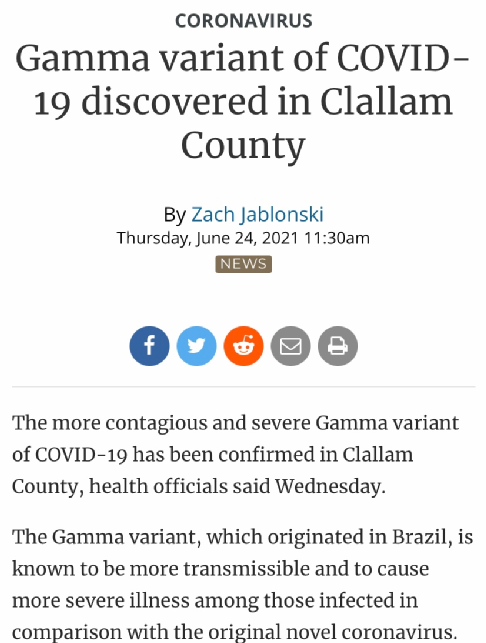 据SEQUIM报的消息,在美国华盛顿州的克拉勒姆县 (Clallam County)已经出现了一种最新毒株Gamma。