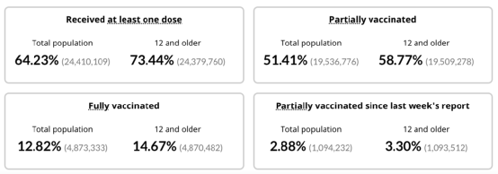 加拿大的疫苗接种率始终在稳步攀升,根据Canada.ca上公布的最新数据,目前已经有64.23%的人接种了第一剂,12.82%的人接种了两剂。在12岁以上的人群中,一剂接种率则达到73.44%,完全接种率为14.67%。