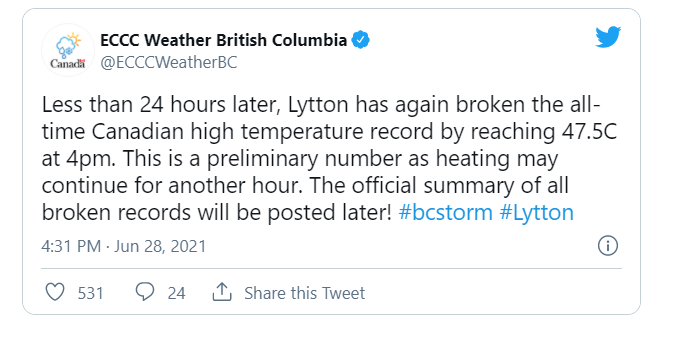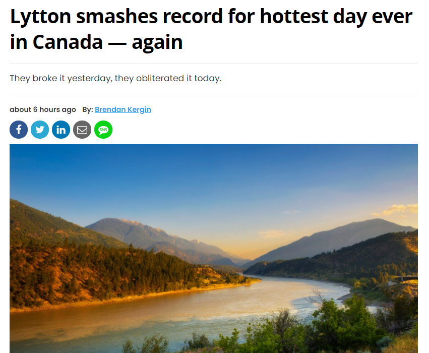 然而就在24小时后,Lytton再次刷新了自己的纪录:47.5℃!体感温度更是超过了55℃ —— 你敢信这是BC省?实在是让人惊掉下巴。