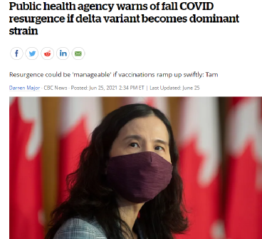 加拿大首席卫生官谭咏诗6月25日也曾警告说,根据国际经验,Delta变种也许会在加拿大构成真正的风险。根据加拿大公布的建模数据,在4月25日至5月23日期间,加拿大的Delta变种病例增加了足足四倍!