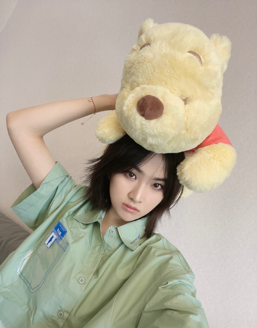 6月1日,姚安娜在社交平台晒出了自己的一组自拍照,配文“超龄儿童过六一”,照片中的姚安娜头顶一只大维尼熊,身穿绿色宽松短袖衬衫,一头利落黑色短发,五官精致,眼神深邃,樱桃小嘴,整个人感觉非常青春。