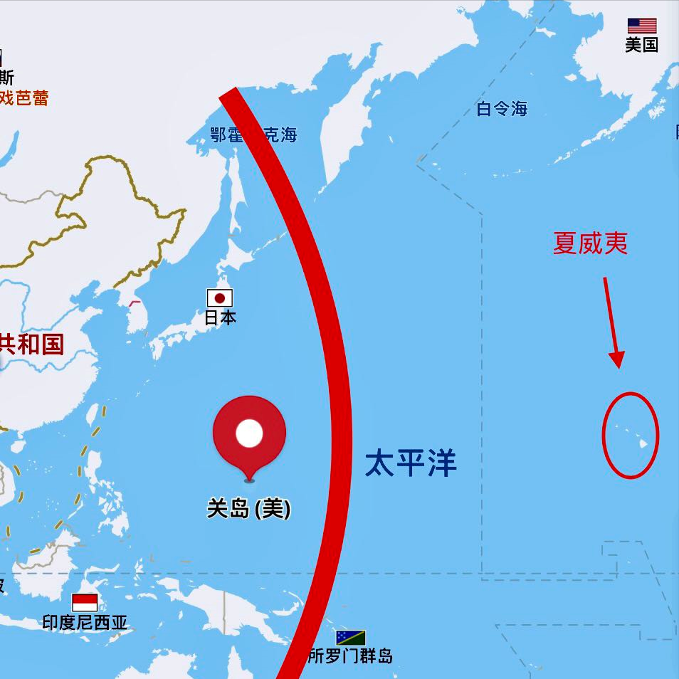 图上可见,美国部分政治精英认为的未来中美战略平衡的“分界线”应在关岛以东洋面,东经150度左右,关岛与夏威夷之间。