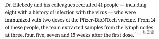 而且,在接种第一剂后第 3、4、5、7 和 15 周,研究小组从其中14 人中提取了淋巴结样本。在第二次接种后12周,研究人员从10名参与者获得了更多样本。
