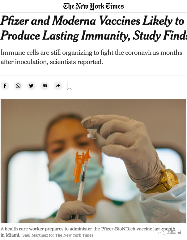 据《纽约时报》首先报道,这可能意味着辉瑞和 Moderna 的接受者可以获得持久的免疫力,持续数年或终生有效,甚至可能不需要打加强剂(booster)。