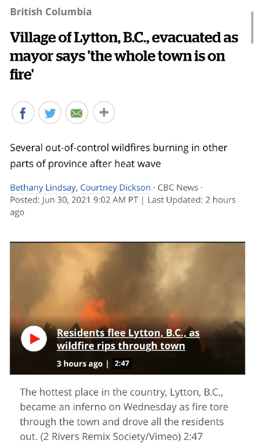 本次高温侵袭之下,利顿曾连续三天创下加拿大有史以来的最高气温。昨天,利顿被通报发生了山火,当时还只烧了1500公顷的面积。
