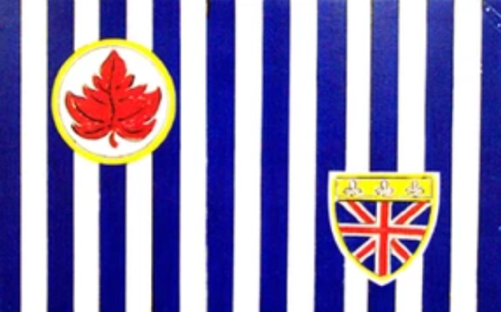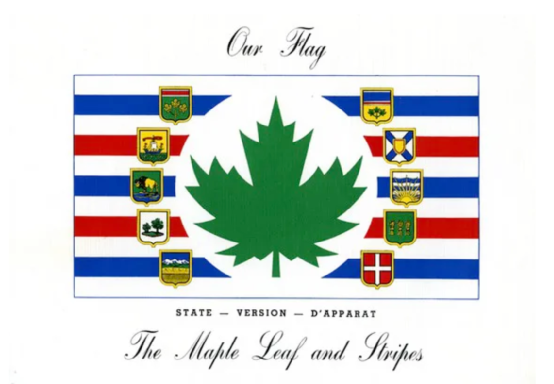 上世纪60年代的加拿大人非常热衷于在国旗设计上表现法语和英语的同等地位,所以大多设计都复杂得不行,因为加了英语标志就得加法语标志。这个设计里的交替的红蓝条纹分别代表英语和法语,然后为了表示各省的平等地位,干脆把10个省的省徽全都怼了上去。