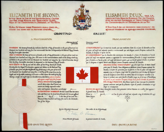 1964年11月15日,单枫叶旗方案通过了下议院的投票。1965年1月28日,加拿大女王伊丽莎白二世正式宣布了新国旗的启用。同年2月15日,在渥太华的国会山庄举行了新国旗的官方升旗典礼,红船旗降下,枫叶旗升起。欢迎人群唱起《啊,加拿大》,接着又唱起《天佑女王》。