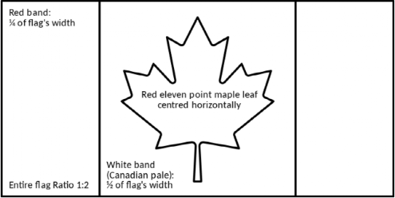 加拿大现在的国旗长宽比为2:1,中间为与国旗等高的白色正方形,两边红色部分为国旗四分之一宽。白色部分正中是一片红色枫叶。