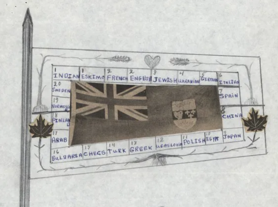 据了解,这份草图当年由萨斯喀彻温省的一位移民提交。它保留了加拿大此前沿用的红船旗(后文会讲到),然后周围写了一圈当时加拿大存在的少数族裔:日裔、华裔、犹太人、阿拉伯人和印度人(Indian在当时也有可能指的是原住民)。