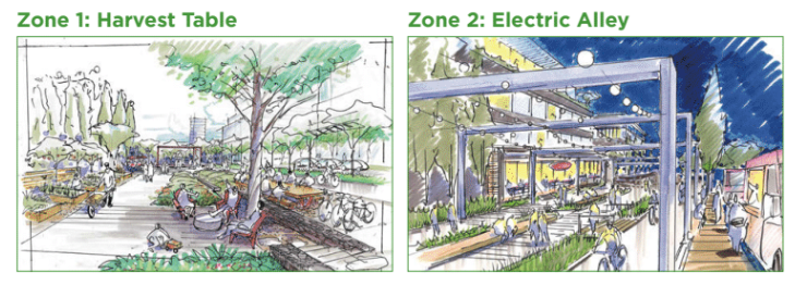 绿道的起点路段1,叫耕食野餐区(Harvest Table),从Fir Street到West Broadway,为人们提供耕种空间与享受食物的休息区。在布勒街(Burrard Street) 會建設一個小廣場,宣示此為綠色通道的起點。这里可以见到可食用的庭园植物、方便邻里户外野餐的长桌子、还有多功能场地,适合各类临时快闪活动。