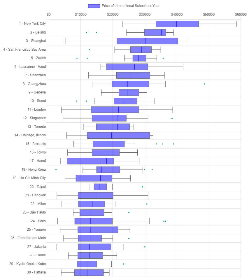 排名第三的上海则显示出了极强的差异性,国际教育成本最低仅为5,136美元,最高则高到43,191美元,相差近十倍,中位数为30,146美元,约合人民币20万元。