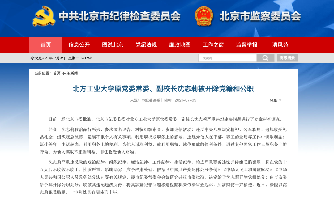 据北京市纪委监委网站7月5日消息,日前,经北京市委批准,北京市纪委监委作出对北方工业大学原党委常委、副校长(副局级)沈志莉开除党籍和公职的决定。近日,法院以沈志莉犯受贿罪,一审判处其有期徒刑十年。