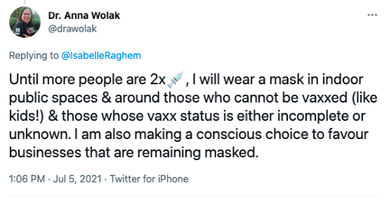“在大多数人打完第二针疫苗之前,我会一直戴口罩。因为还有很多小孩子不能打疫苗,很多人只打了第一针疫苗。”
