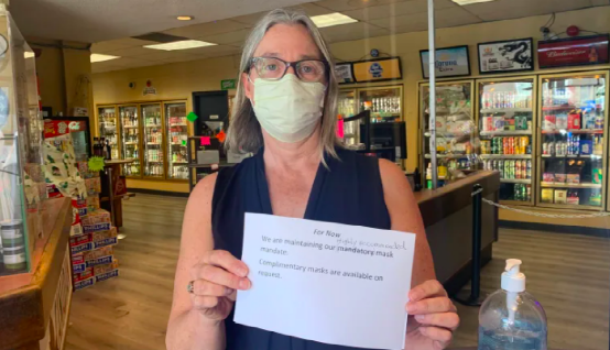 位于温哥华的一家Liquor Store,最近也因为戴不戴口罩的问题,跟客人吵了起来。最后,店长巴布·怀特 (Barb Whyte)不得不撕下了店内“强制戴口罩”的告示,换成了“强烈建议佩戴口罩”。