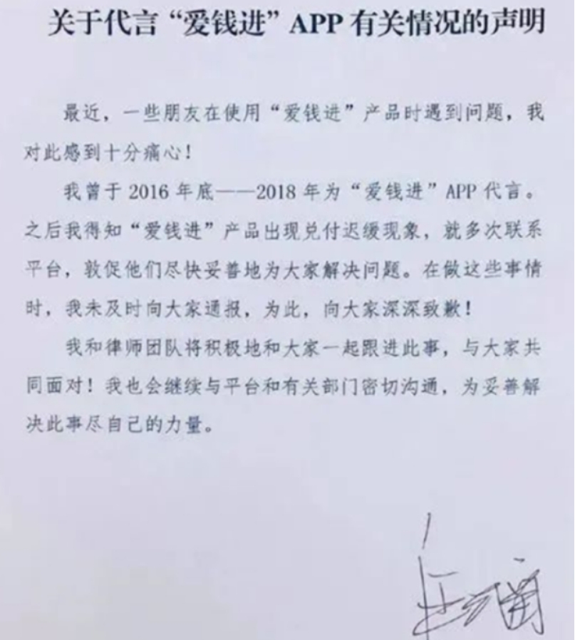 彼时,汪涵发声明道歉,“得知“爱钱进”产品出现兑付迟缓现象,就多次联系平台,敦促他们解决问题。在做这些事情时,未及时向大家通报,为此道歉。”