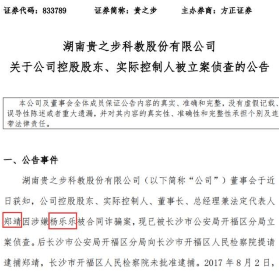 2015年,杨乐乐在闺蜜郑靖介绍之下,签订了《出资认购协议》,出资788万购买贵之步131.3333万股股份。