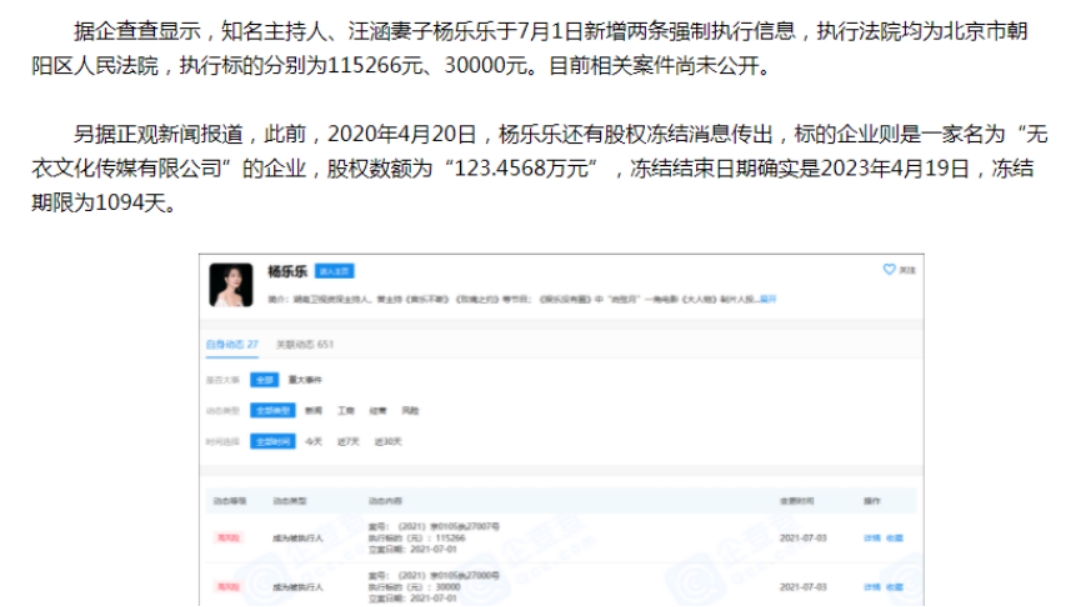 原来杨乐乐持股的一家公司被投诉了,作为持股方的杨乐乐被强制执行,因此被列入失信人名单。