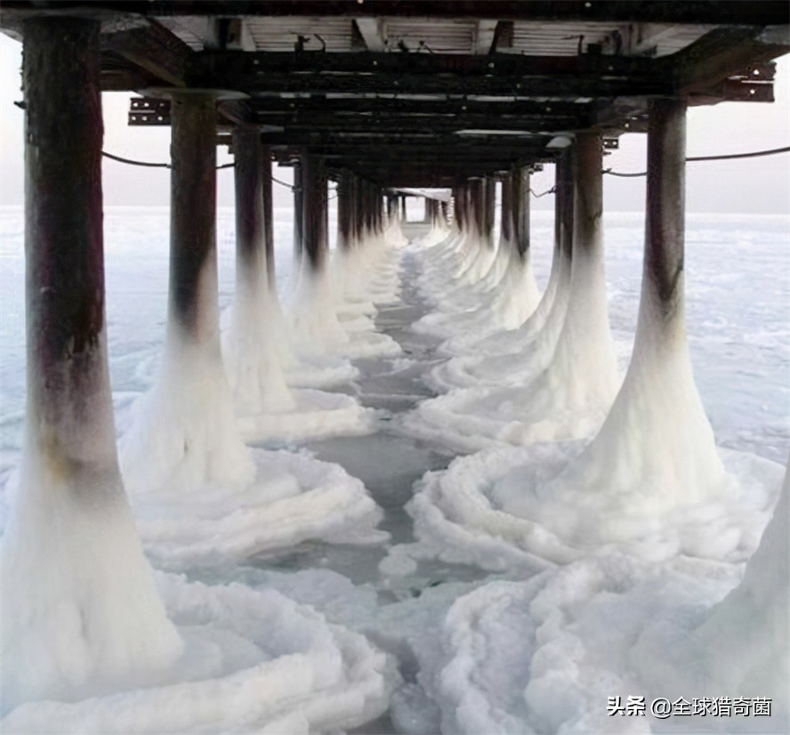 寒潮来袭的天气桥下的柱子都变成了冰雕,