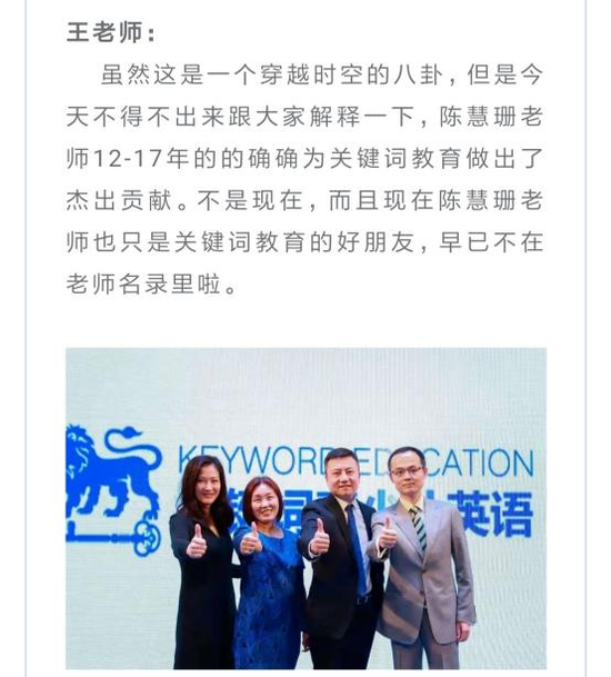 仅从该英语培训机构发表的声明来看,陈慧珊在四年前,不知道为了支持朋友,还是愿意兼职,确实担任过一段时间的英语培训教师。前前后后,加起来有十年的时间。