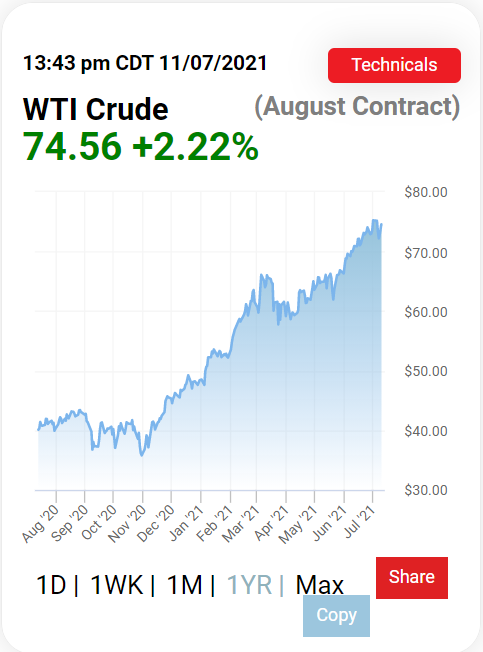 本周早些时候,基准西德克萨斯中质原油 (WTI) 油价短暂飙升至六年来的最高点,周五收于每桶 74.56 美元。能源需求随着旅行的恢复、经济的重新开放以及OPEC+国家和美国页岩油生产商的持续生产限制而反弹,石油市场呈上涨态势。