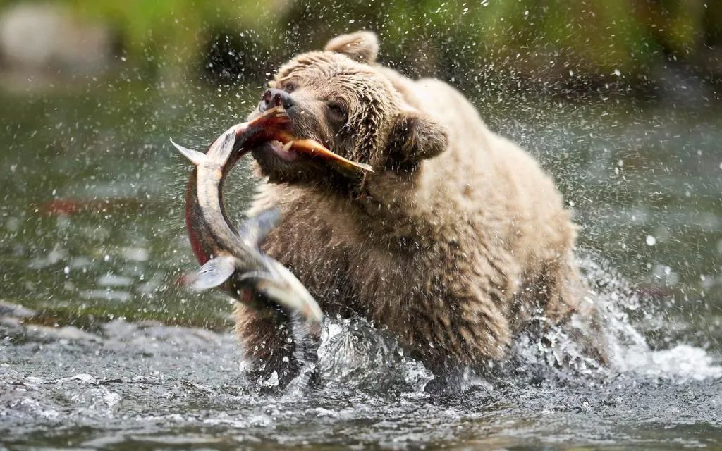 - 狂野的原始温带森林深处棕熊捕食三文鱼的最佳时间和途径。
