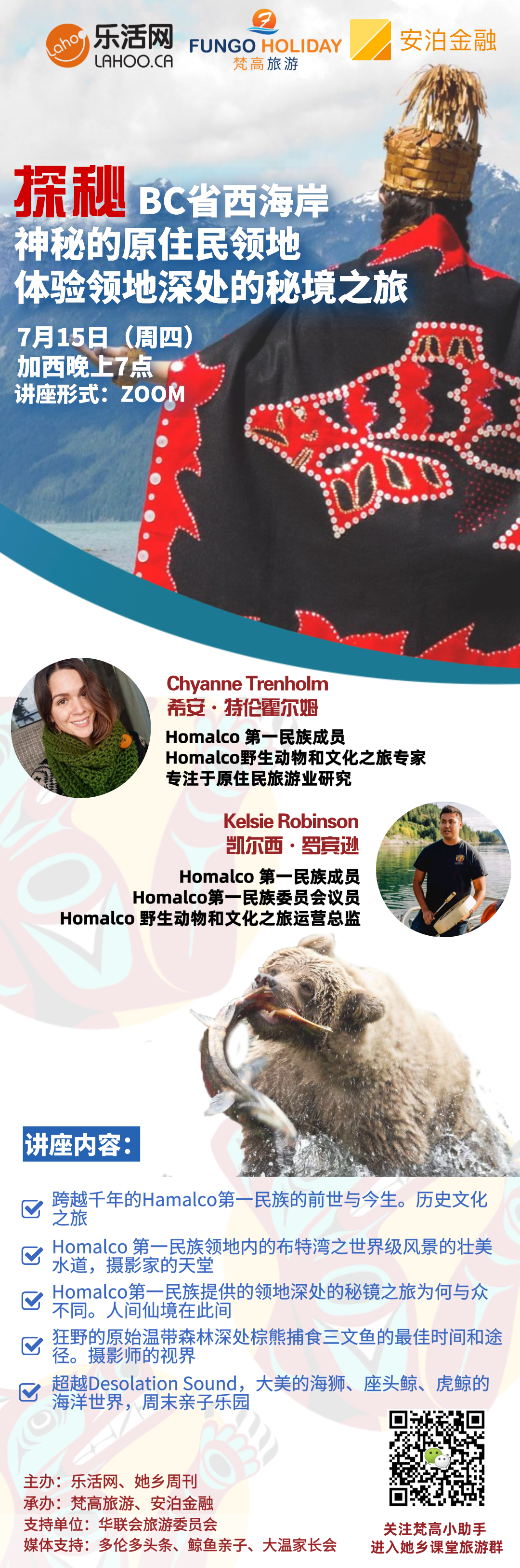 7月15日温哥华时间19:00-20:30, “她乡 · 旅游课堂”特邀Homalco第一民族的成员、野生动物和文化之旅专家Chyanne Trenholm,带我们开启探访领地秘境的云端之旅,讲述那些我们不知道的故事。讲座还特地邀请了Homalco第一民族委员会的议员,Kelsie Robinson凯尔西·罗宾逊先生来回答听众的问题。