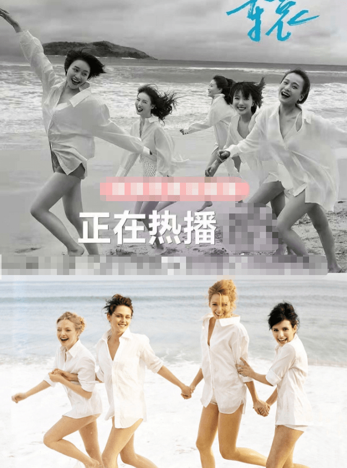 构图、姿势、服装都差不多,不同之处在于肩带。几位主演衬衫松松垮垮地搭在身上,不约而同地露出了内衣肩带。她们还是被观看、被审视的对象。