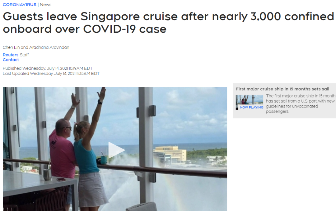 据报道,这名感染患者已经接种两剂疫苗。乘客 Rishi Lalwani 说,考虑到游轮采取的检测和社交距离措施,他对这一感染病例感到惊讶。Lalwani 说:“新加坡的疫情似乎基本上得到了控制,所以,是的,在 1,700 名客人的游轮中发生这种情况似乎有点罕见。”