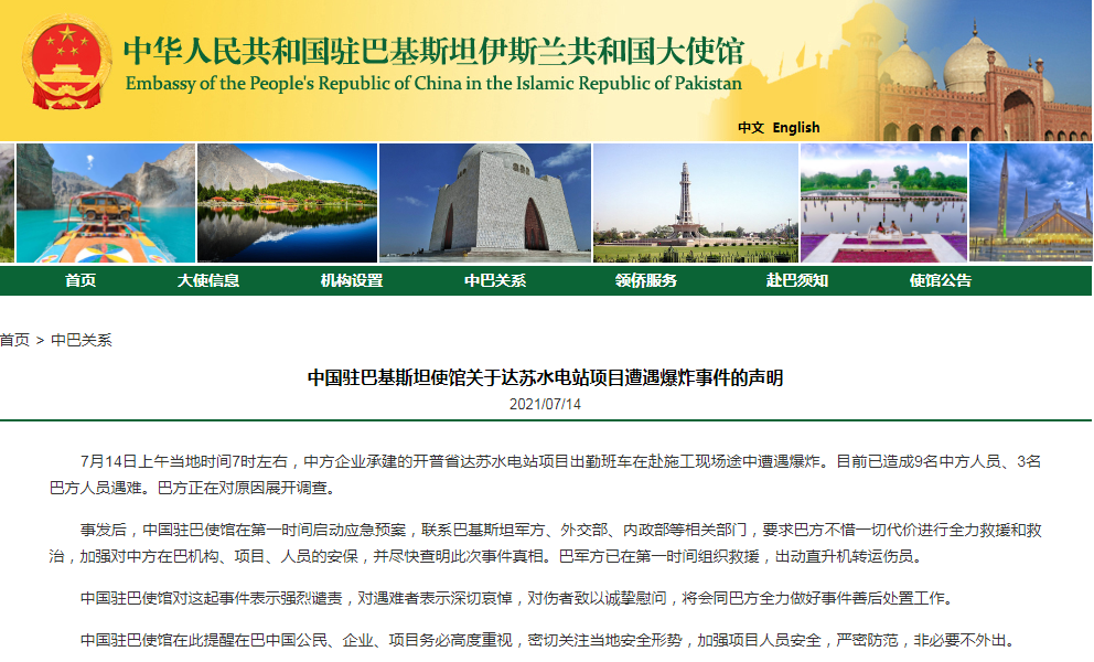 声明称,据初步报道,9名中国公民和3名巴基斯坦公民丧生。声明还称,地方政府正在为伤者提供一切可能的援助。
