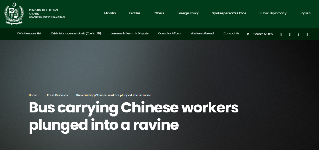 巴基斯坦外交部在声明中表示,巴外交部正与中国大使馆保持密切联系,协作配合。声明说,巴基斯坦政府和人民向在事故中丧生的中巴工作人员的家属表示诚挚的慰问。我们也祈祷伤者早日康复。