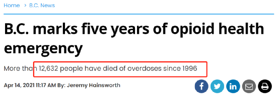 自2016年4月14日始,BC省宣布进入吸毒过量卫生紧急状态已整整5年有余。在过去的25年中,有超过12,632名BC省民死于吸食非法药物——死亡人数基本上相当于BC省一座小城特雷斯(Terrace)的总人口。
