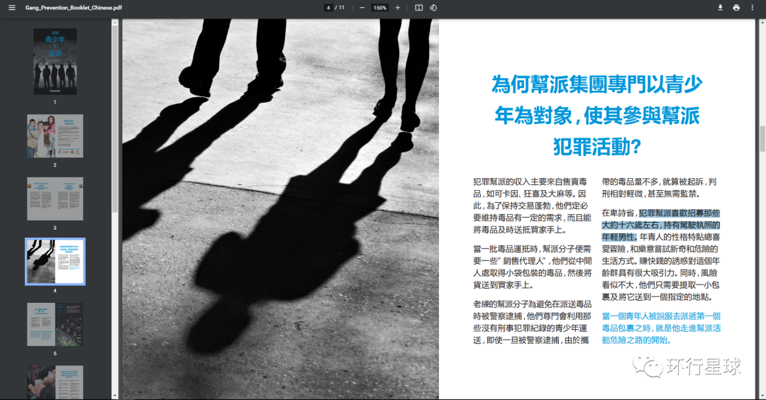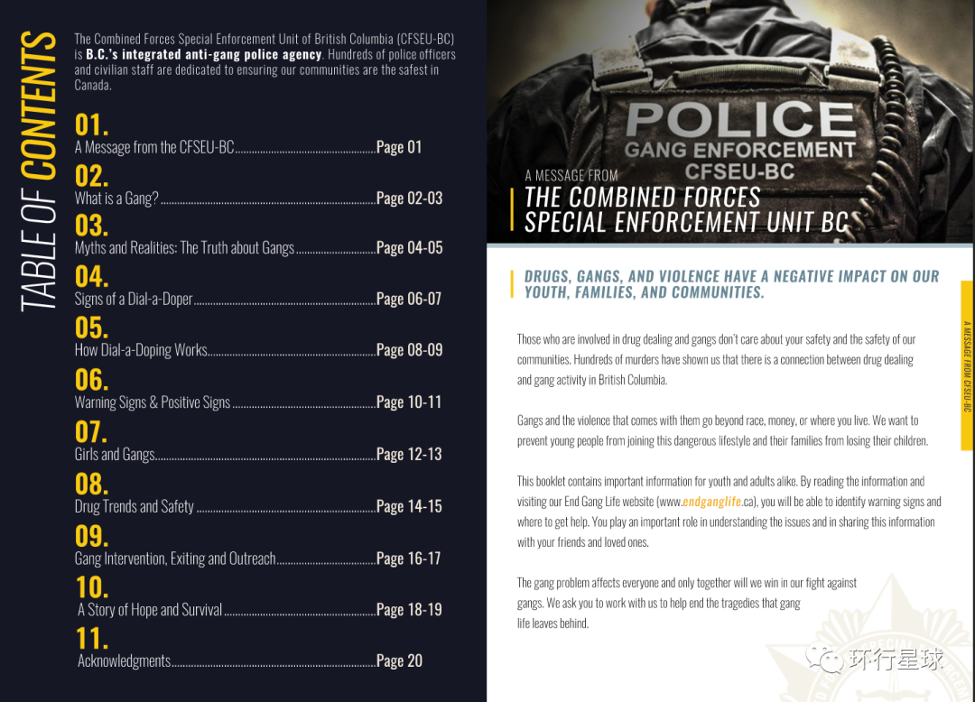 他们甚至吸纳不谙世事的青少年。加拿大全国有434个青少年团伙,成员约7000余人。图为加拿大反帮派联合特别执法部门(CFSEU-BC)网站,与《认识青少年及帮派》手册内页。图:cfseu.bc.ca▾