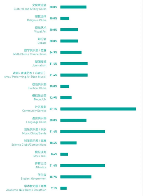 相比往年,2024届哈佛新生在社区服务中更加活跃。87.1%的受访者表示最受欢迎的高中课外活动是社区服务,这一数据较 2023 届大幅增加。其次是体育运动,占51.4%,参加音乐俱乐部/乐队的占51.4%,参加学生会的占35.7%。在课外活动中,选择戏剧和新闻报道的均占31.4%,参加数学俱乐部的只占 24.3%,参加科学俱乐部的占18.6%。而在2019年,参加数学俱乐部和科学俱乐部的占比都是32%,戏剧与新闻报道则占比不高。这种变化也说明课外喜欢文理活动的学生比例出现了变化。