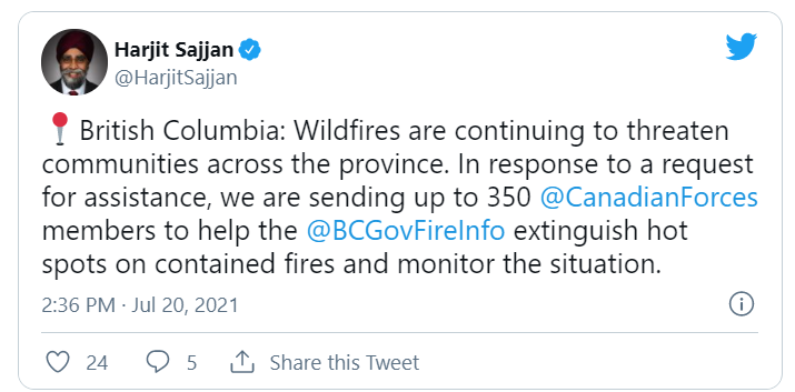 随着紧急状态的宣布,加拿大联邦政府派遣了军队帮助BC省救灾。国防部长 Harjit Sajjan 在社交媒体中表示,政府已经批准了一项帮助请求,并将派遣多达 350 名加拿大军队人员帮助 BC 省。救灾人员正在与强风作斗争,大火蔓延到非常干燥的森林,灭火一直很困难。周一,在山火规模扩大后,数百人被命令撤离他们的家园。疏散发生得非常突然,官员们表示,他们无法确认有多少人离开家园。