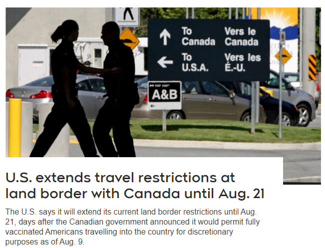 【加拿大乐活网lahoo.ca 江礼且综述】在加拿大政府宣布从 8 月 9 日起允许完成免疫接种的美国旅客入境后,美国政府于 7 月 21 日发布新的边境规定,称8 月 21 日前,美国禁止加拿大人跨越美加边境进行非必要旅行。