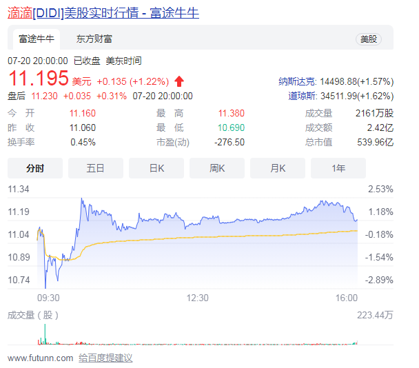 7月20日滴滴收盘价格为11.195美元,较开盘上涨1.22%。滴滴自6月29日低调上市,7月2日被查办以来股价从14元每股一路来到11元每股左右,后期逐渐稳定有涨有跌。