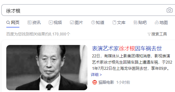 记者从上影集团方面获悉,“老绿叶”徐才根因意外车祸,抢救不治,于今天上午9:25在上海龙华医院去世,享年89岁。