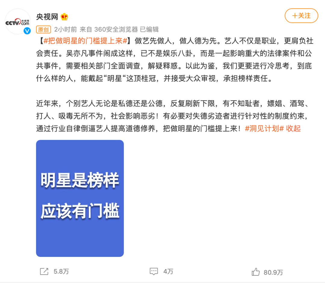 近年来,个别艺人无论是私德还是公德,反复刷新下限,有不知耻者,嫖娼、酒驾、打人、吸毒无所不为,社会影响恶劣!有必要对失德劣迹者进行针对性的制度约束”