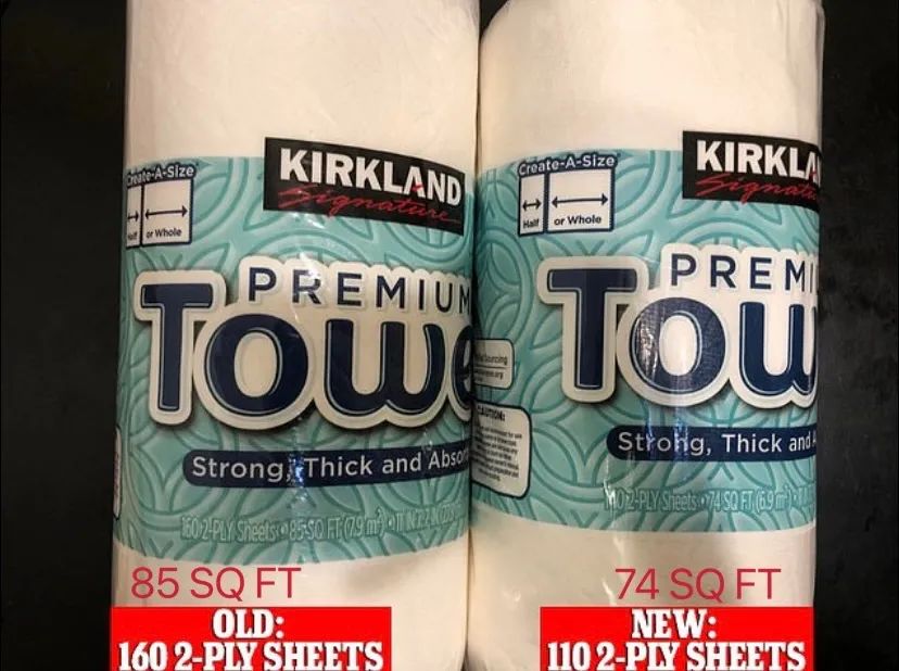 Costco自有品牌Kirkland厨房纸巾,虽然看起来大小差不多,但仔细检查就发现,容量已经从85平方英尺(左)缩小到74平方英尺(右),厚度也从160变成了110????