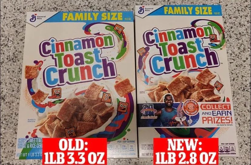 大型谷物制造商General Mills的肉桂吐司麦片,直接从1磅3.3盎司(左)缩水到1磅2.8盎司(右),盒子都能明显看出不一样大????