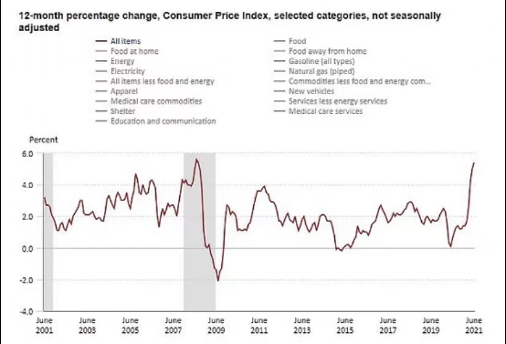 美国劳工部的数据显示,消费者价格指数在12个月内上涨了5.4%