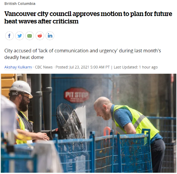 在BC省6月底经历罕见高温天气后,温哥华市政府7月24日一致通过了一项议案,将为未来的热浪做好更加充足的准备。
